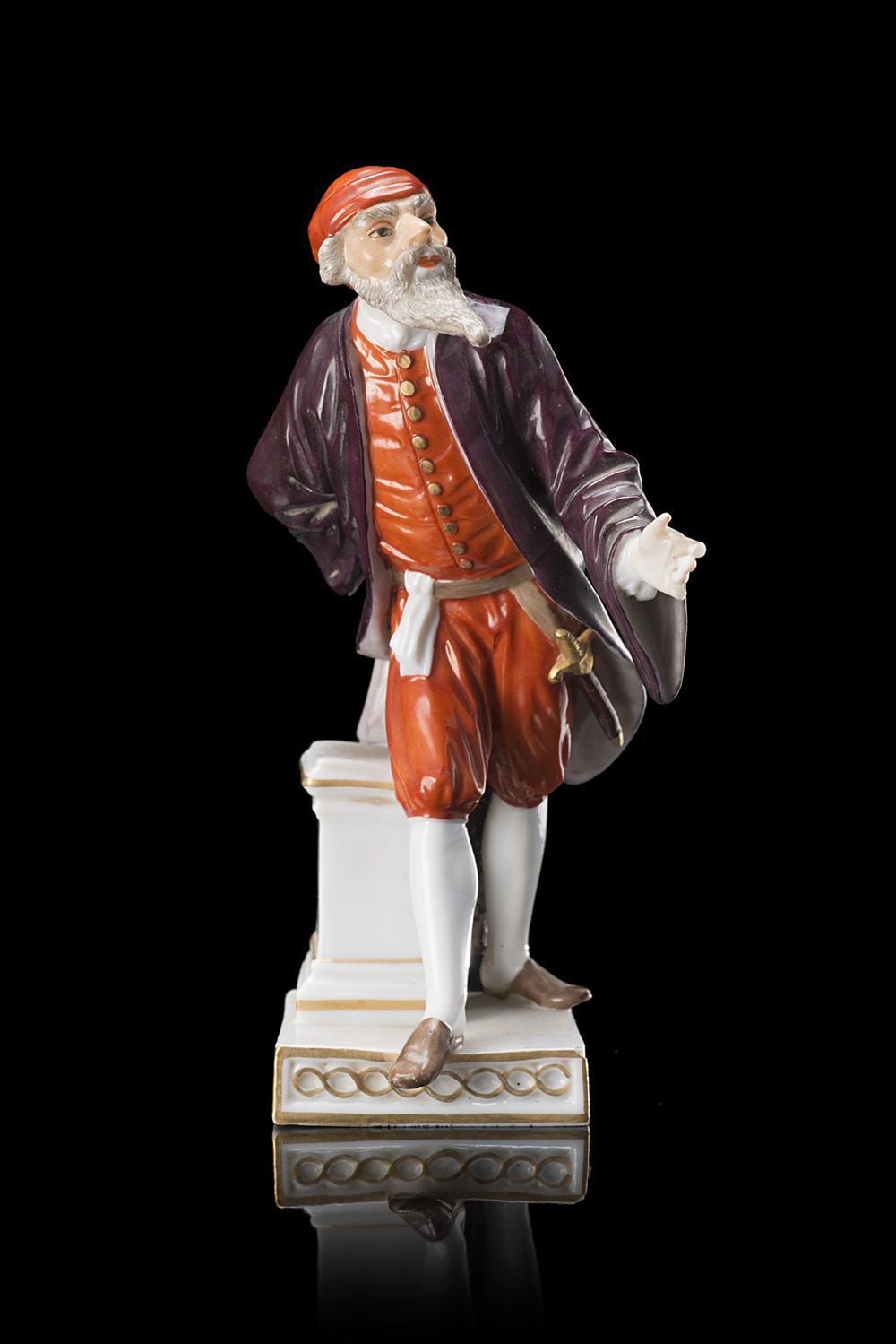 Piccola plastica raffigurante figura di mercante con barba bianca in porcellana. Marca di fabbrica in oro. Sec. XX (h. cm 15) (difetti e mancanze)