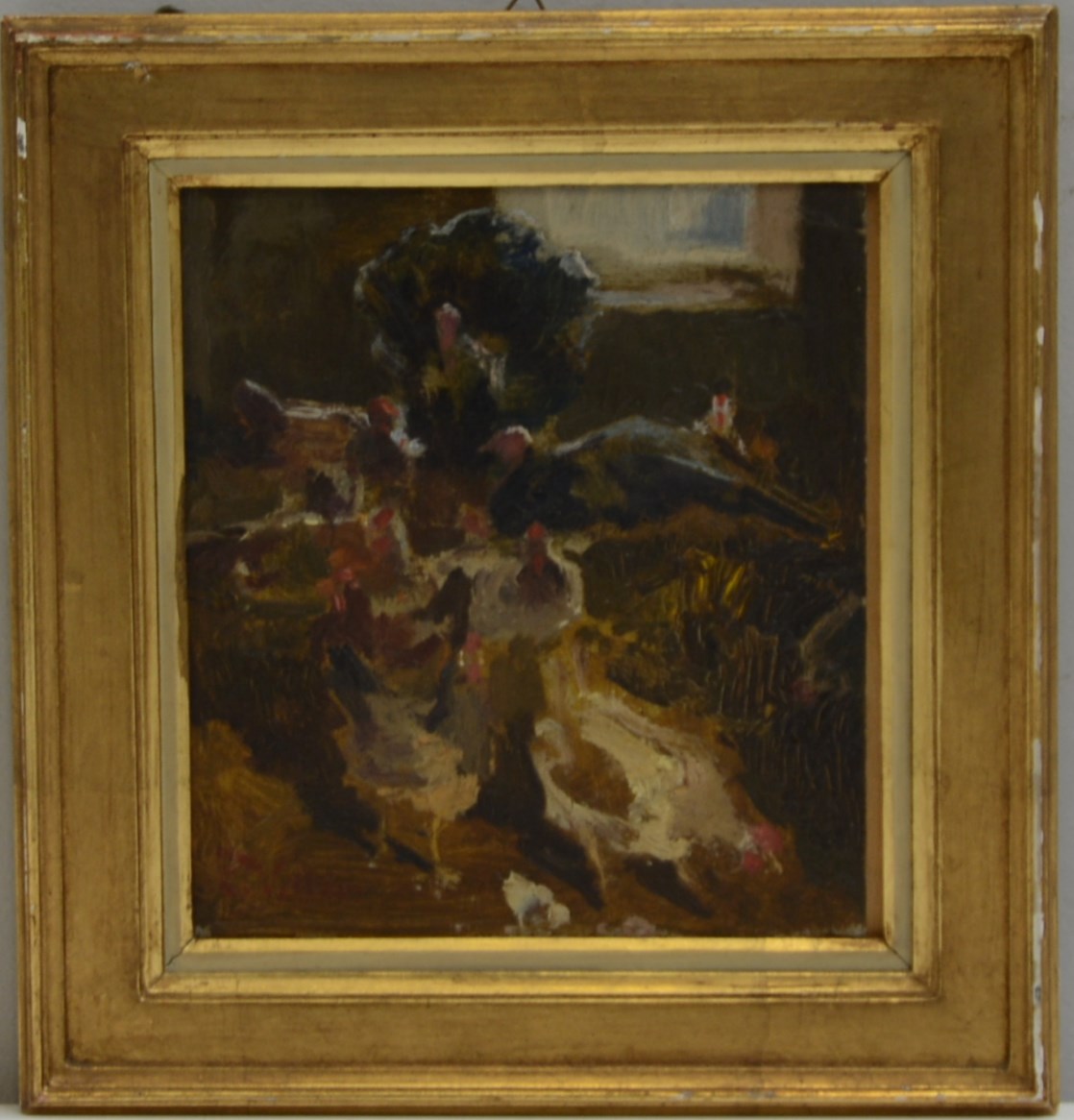 Carlo Vittori Cremona (1881- 1943) "Galline e tacchini" olio su cartone (cm 21x19) Firmato in basso a sinistra. In cornice