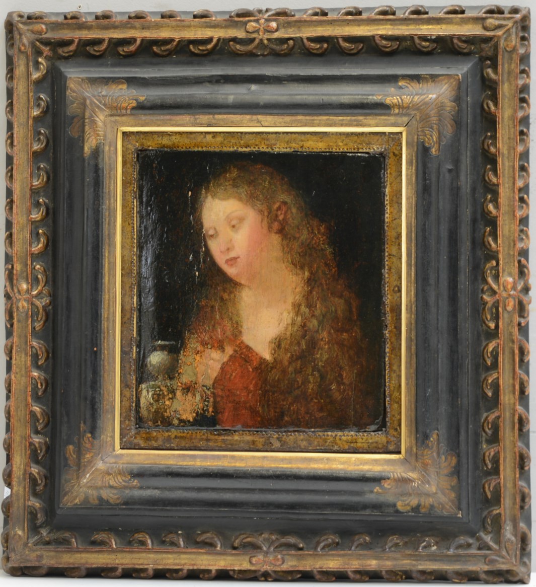 Ignoto "Figura femminile" antico dipinto ad olio su tavola (cm 29x25) in bella cornice del sec. XVII in legno ebanizzato, dorato e intagliato (difetti e mancanze)
