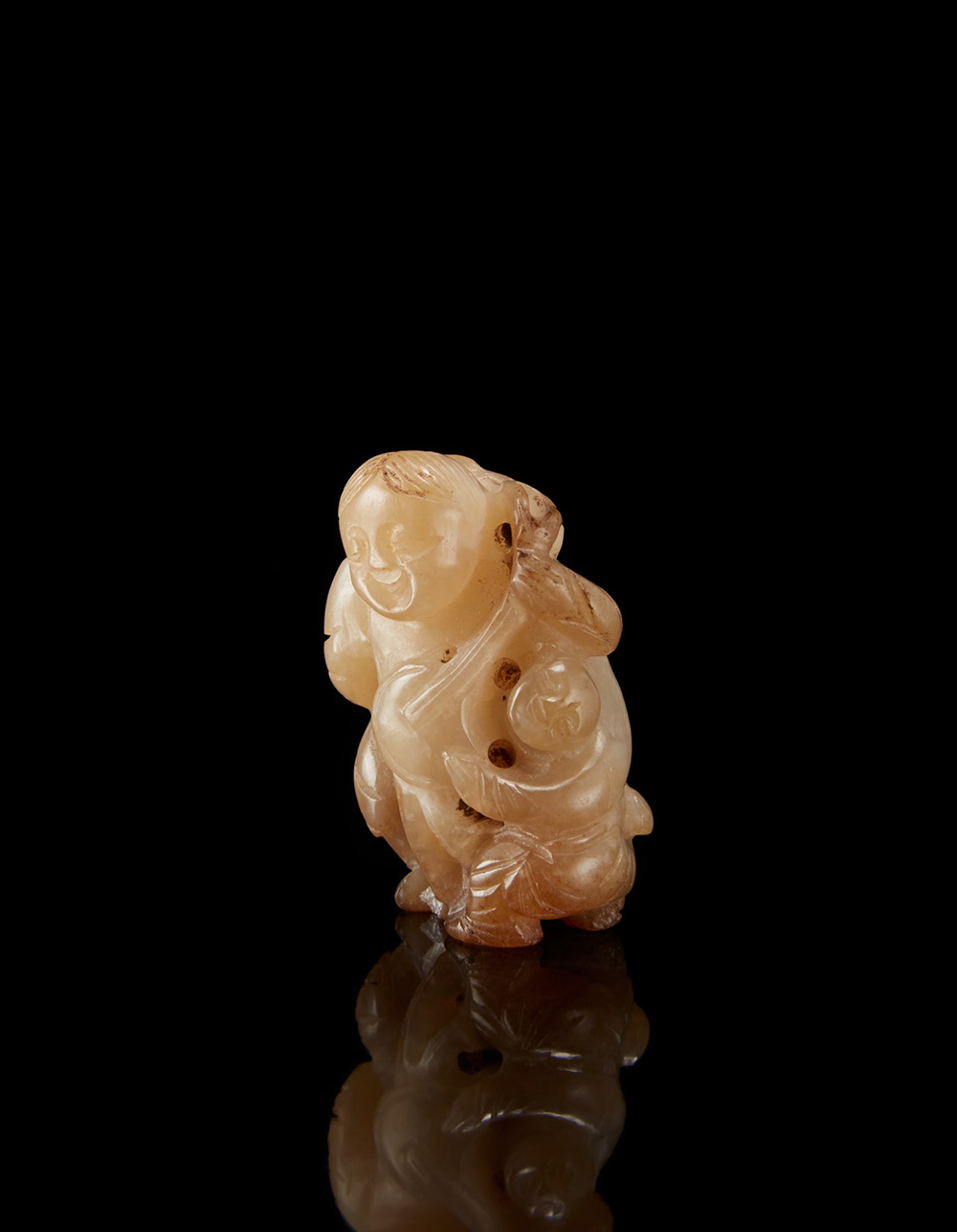 Piccolo intaglio in giada grigia e russet con musicisti (difetti) Cina, sec. XX (h. 5 cm.)