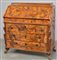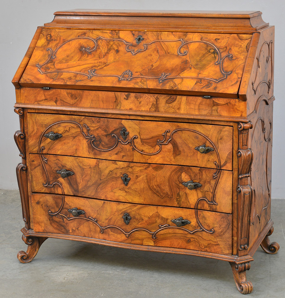 Ribalta in stile lombardo in noce e radica con anta ribaltabile celante vani cassettini e segreti. Fronte a tre cassetti, montanti e piedi intagliati (cm 104x120x54)