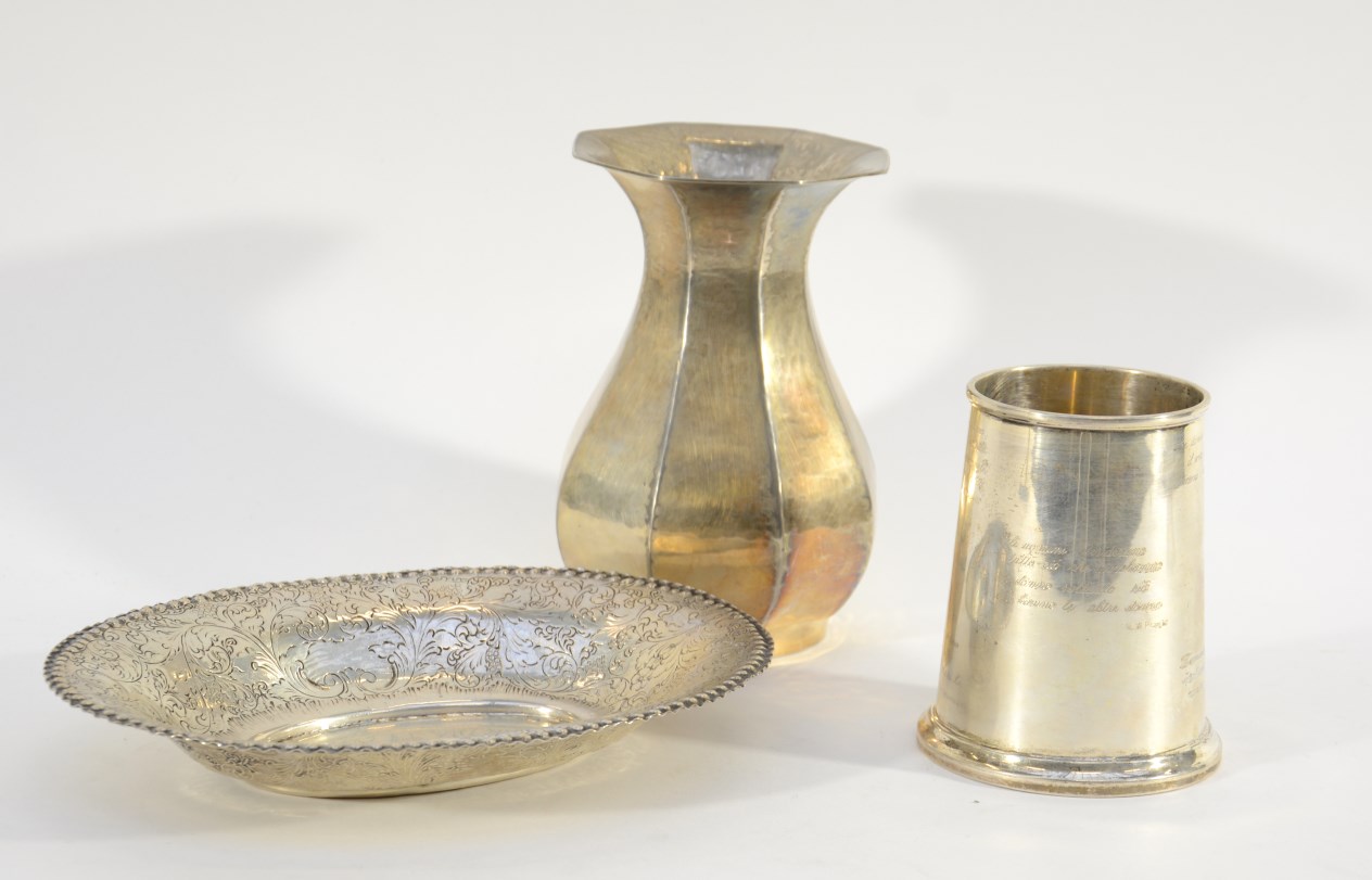 Lotto composto da un boccale e un vassoietto in argento (gr 470 ca) e un vaso in metallo argentato (lievi difetti)