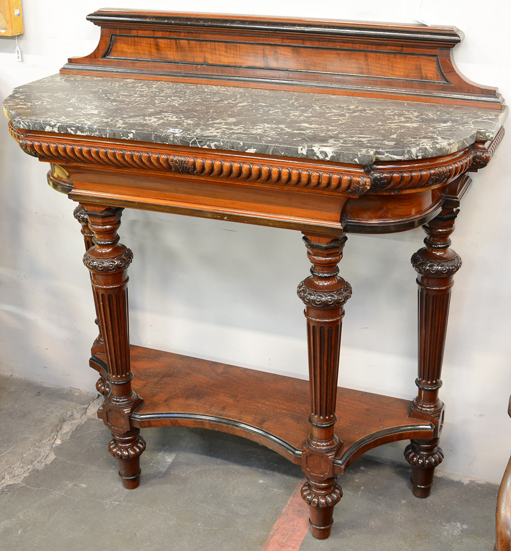 Consolle con alzatina in mogano e profili ebanizzati, gambe tornite e scanalate riunite da pianetto sagomato. Piano in marmo (cm 105x104x48)