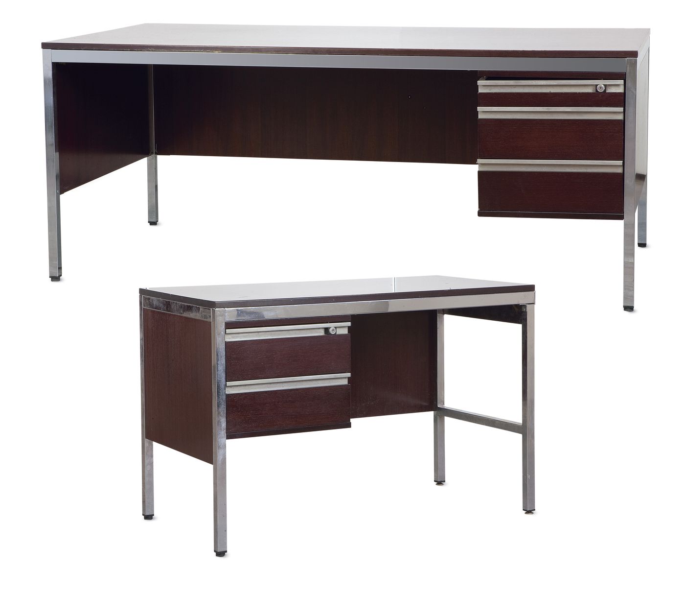 FAZIOLI D. - Scrivania e scrittoio per dattilografia serie Galileo. Struttura rivestita in palissandro e acciaio inox. Produzione MIM 1970 circa. scrivania cm 75x180x90 dattilo cm 75x113x58. Bibl.: "Mettiamo su casa insieme n° 10", supplemento di Abitare n° 136, giugno 1975, pag. 18.