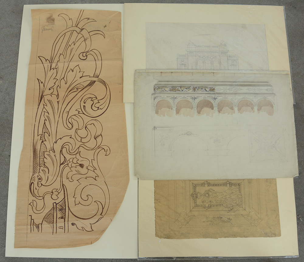Lotto 186 | Lotto composto da quattro disegni architettonici e di ornato pittorico,...
