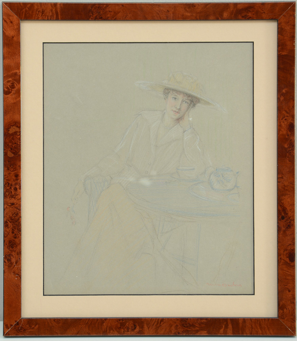 Marguerite Mary Darbour "Ritratto di signora al tavolino" matite colorate su...