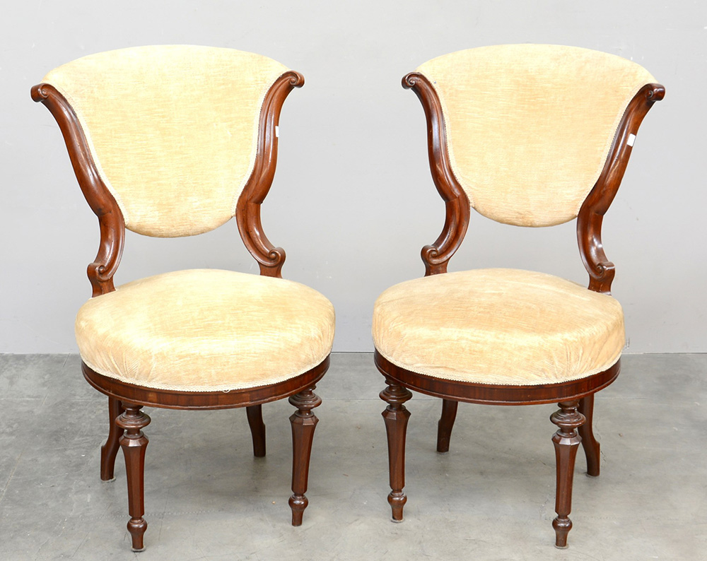 Coppia di seggioline da camera ì Luigi Filippoî schienale sagomato gambe anteriori sfaccettate. Secolo XIX