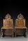 Coppia di panchetti in legno con schienale pannellato con parte superiore scolpita a volute, riccioli e valve di conchiglia. Sedute e montanti mossi (cm 70x133x44) Sec. XVII (difetti e restauri)