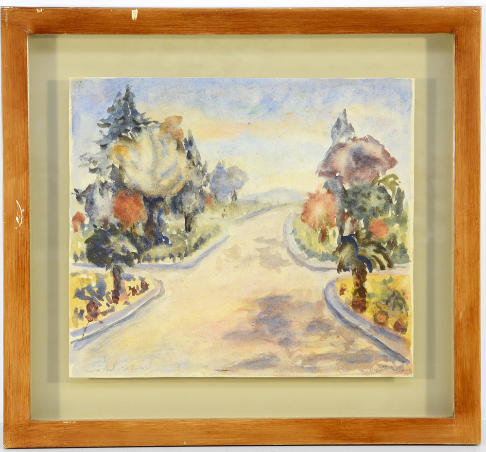 Firma indecifrata "Paesaggio" acquerello su carta (cm 29,5x34) firmato in basso a destra. In cornice