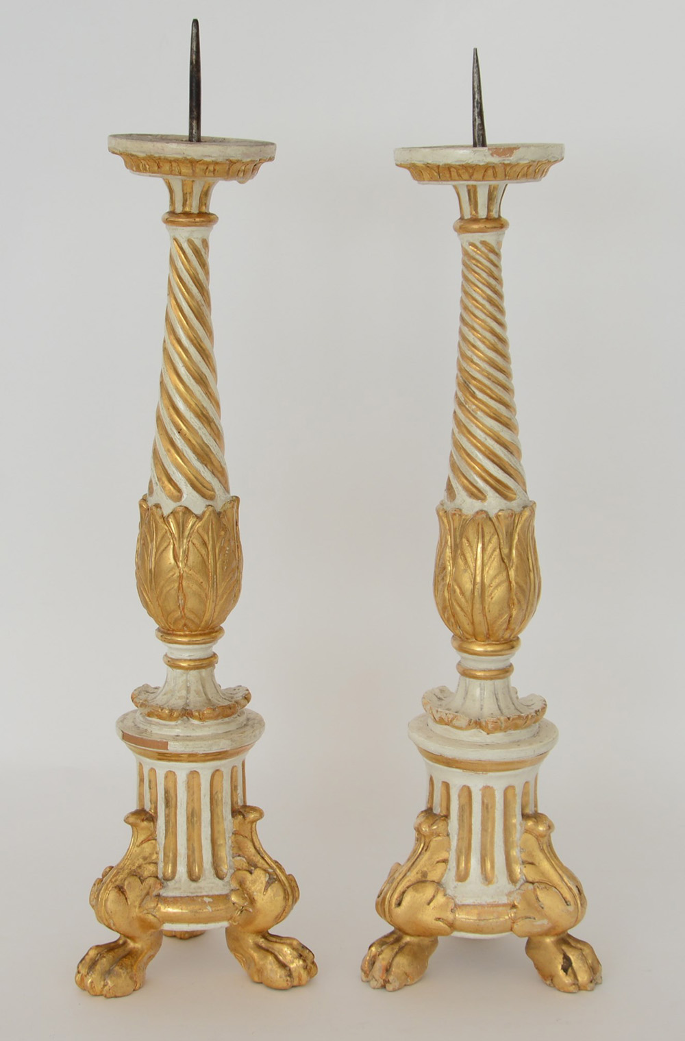Coppia di candelieri in legno intagliato e dorato. Sec. XVIII (h cm 45)