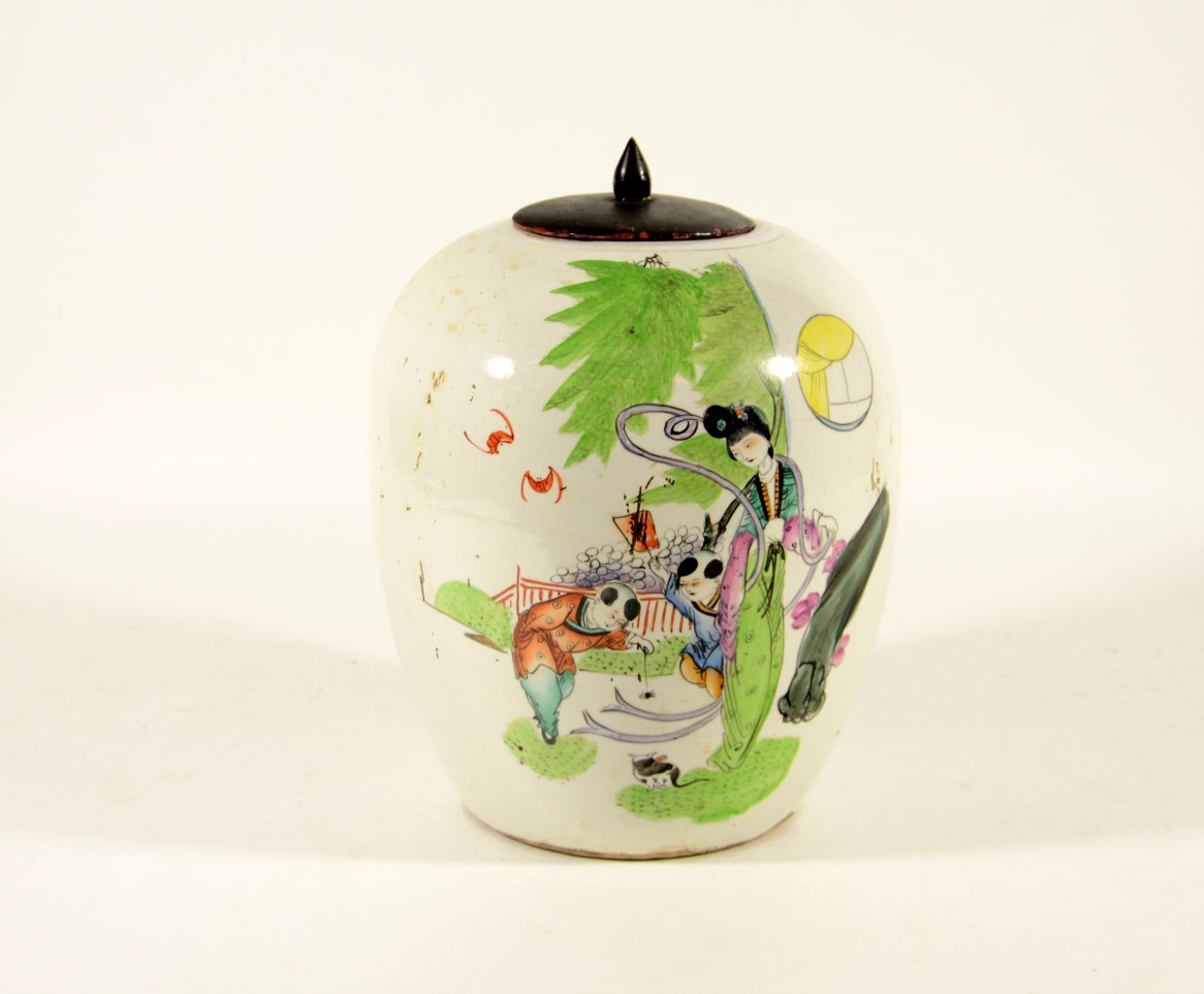 Giara in porcellana policroma con figura femminile e fanciulli Cina, sec. XX (h. 29 cm.)