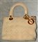 Christian Dior: borsa Lady Dior in pelle scamosciata color miele, charms in metallo dorato e logato, manici in pelle, largh. cm 24 (gravi difetti)