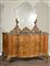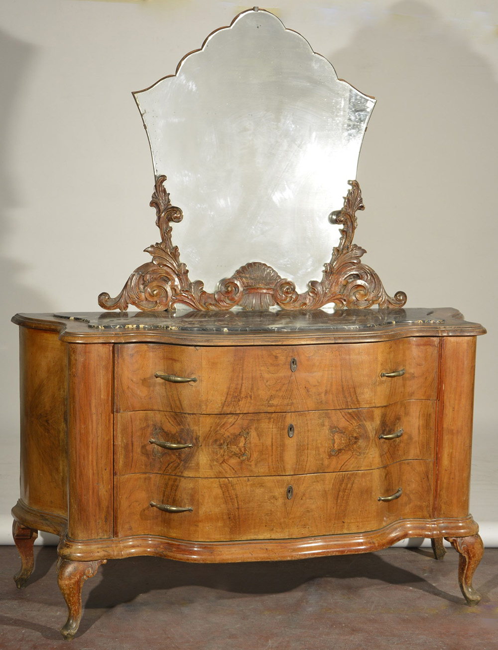 Cassettiera impiallacciata con specchiera in legno di noce con piano in marmo...