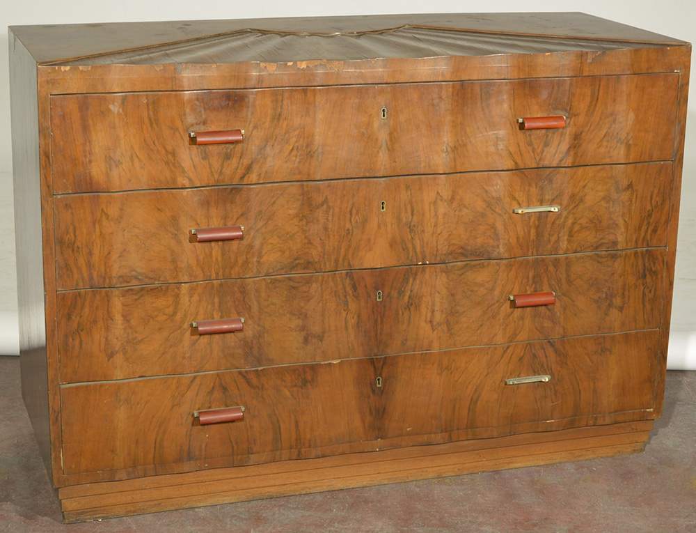 Cassettiera Novecento in legno impiallacciato, maniglie in metallo e bachelite. Italia anni 30. (cm 131x89x50) (difetti e mancanze)