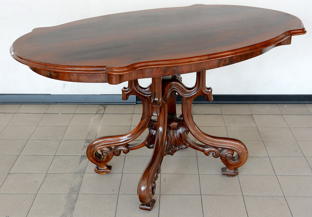 Tavolo con piano di forma sagomata con gambe mosse e intagliate a volute e riccioli (cm 142x76x90) (difetti e restauri)