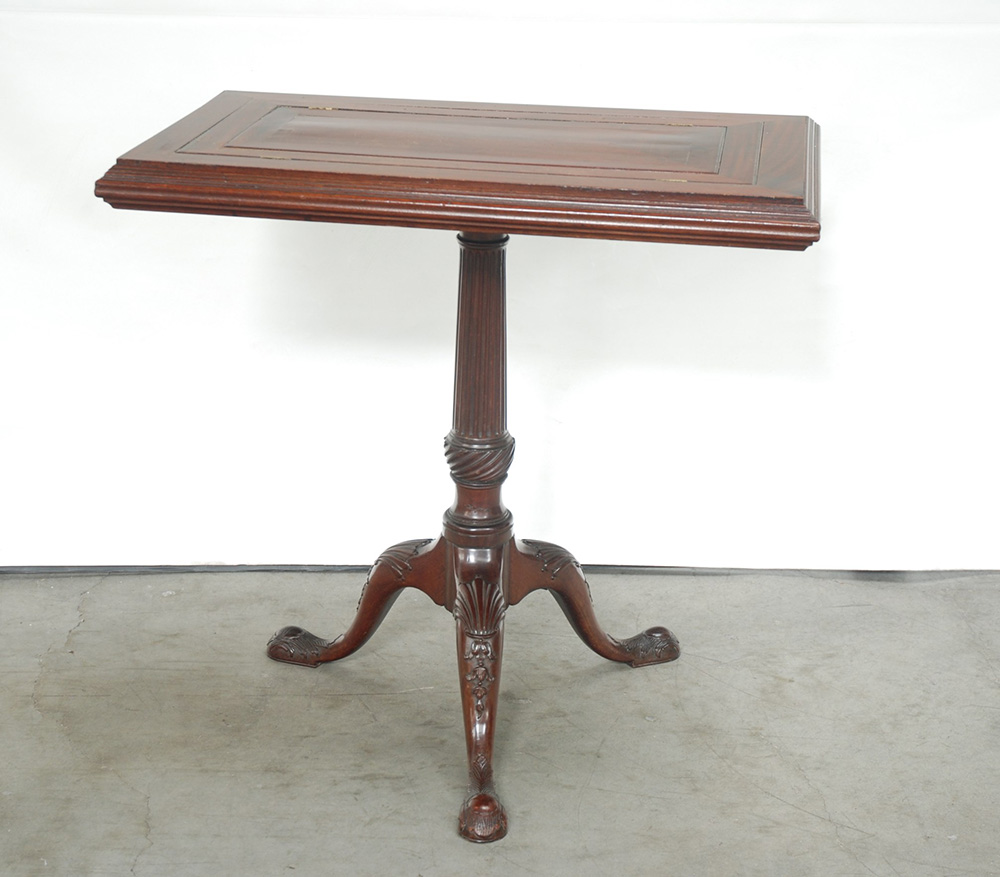 Tavolo leggio in mogano con gamba a tre piedi scolpita e decorata (cm 81x81x51) (difetti)