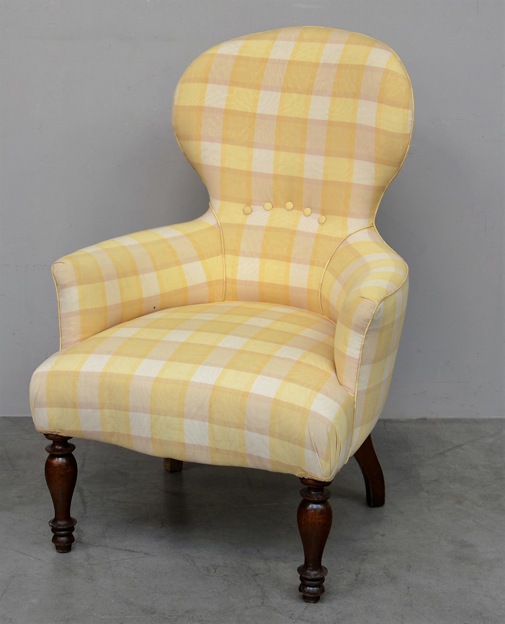 Poltrona da riposo con gambe anteriori tornite, rivestita da tessuto a quadri giallo (lievi difetti)