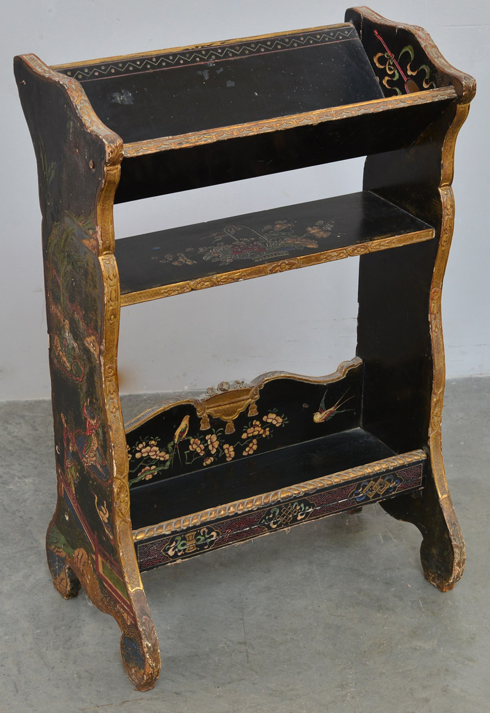 Portariviste in legno laccato con profili dorati e montanti e piani decorati a figure, paesaggi, volatili e oggetti sparsi. Sec. XX (cm 50x73x30) (difetti)