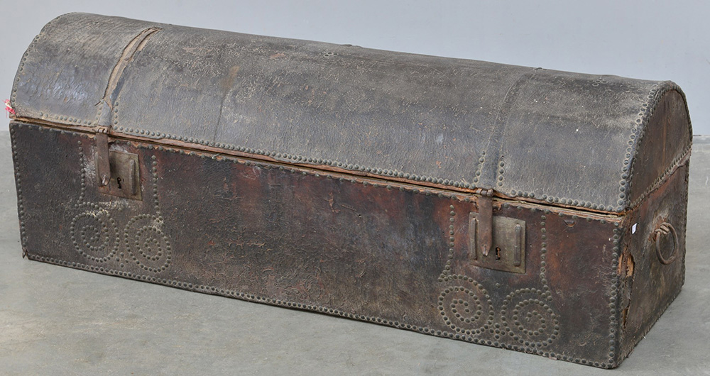 Baule da carrozza in pelle decorata a borchie sec. XVIII (difetti e mancanze)