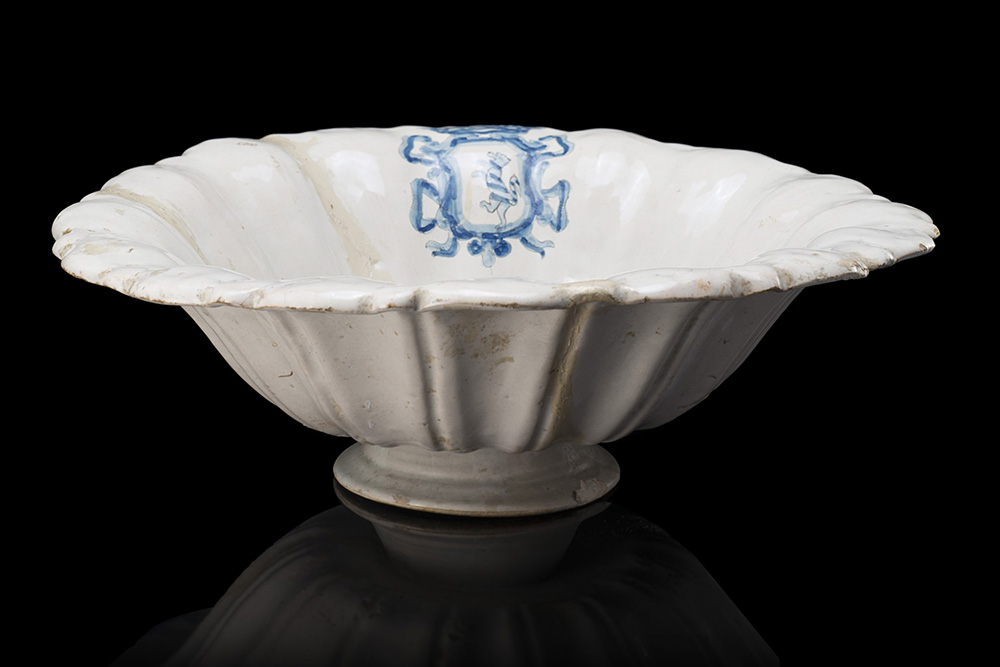 Coppa baccellata a bordo estroflesso e ondulato in maiolica bianca in stile compendiario. Sul bordo Ë dipinto uno stemma araldico in monocromia blu (d. cm 35 x h. cm 10) Deruta, sec. XVII (rotture, restauri, piede incollato)