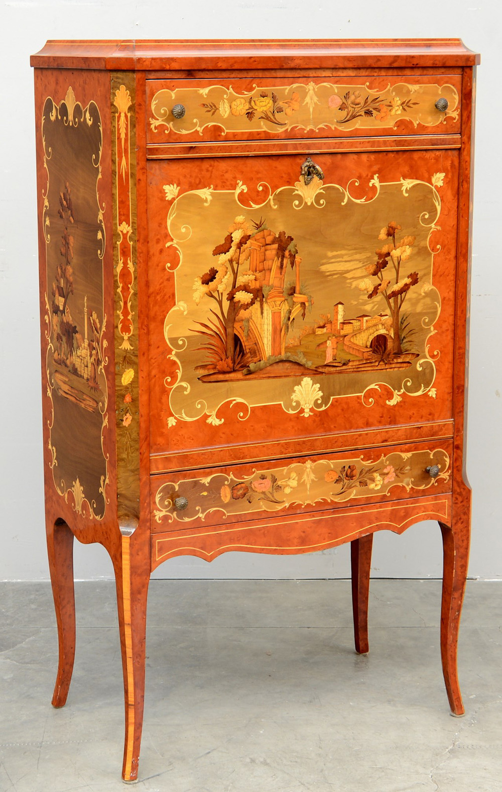 Mobile bar ad un'anta e due cassetti, interamente pirografato a paesaggi e...