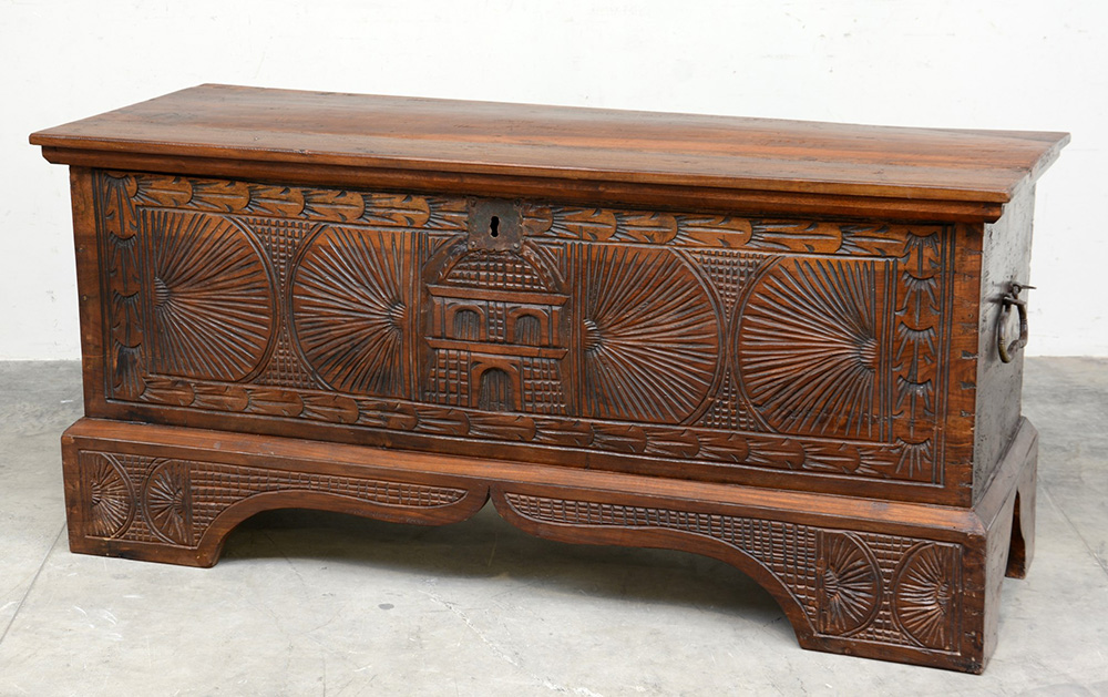 Antica cassapanca con fronte e fascia intagliata a motivi geometrici. Piedi a...