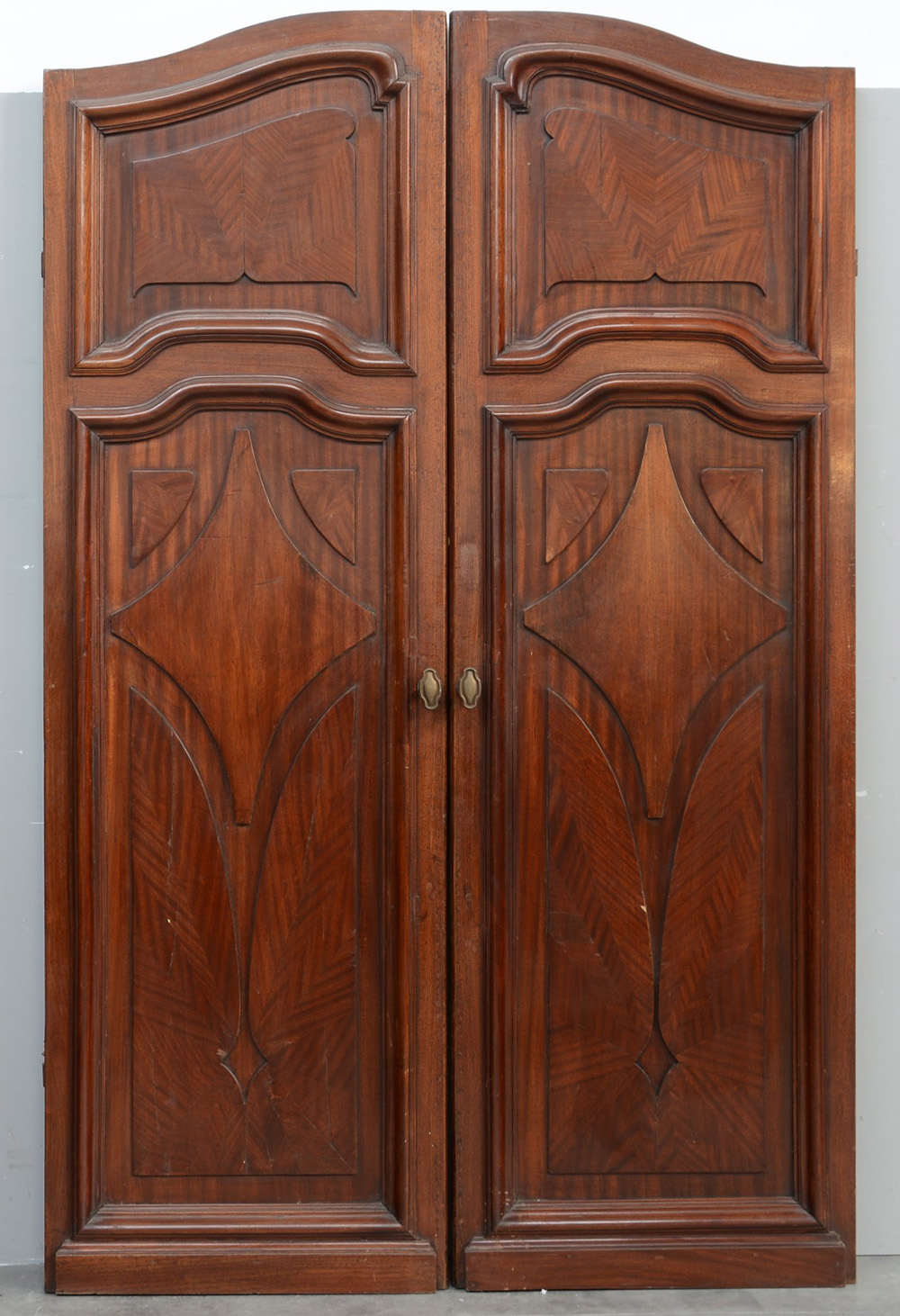Coppia di antiche ante di forma sagomata in noce pannellate a motivi...