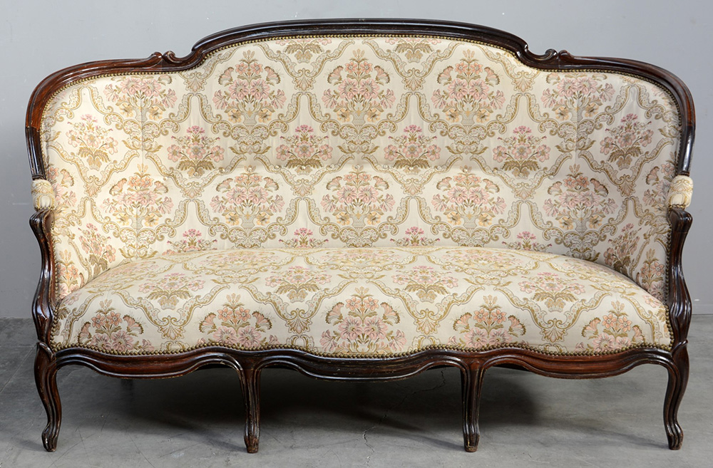 Divano con schienale, braccioli e montanti sagomati e scanalati. Fascia e gambe mosse, sec. XIX