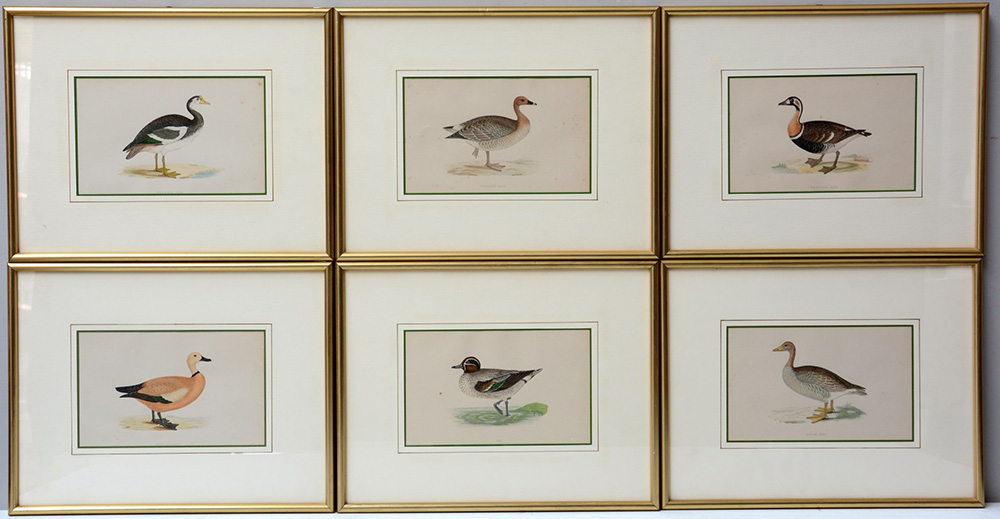 Lotto composto da sei stampe a colori raffiguranti differenti specie di anatre e oche (cm 14,5x23) In cornice