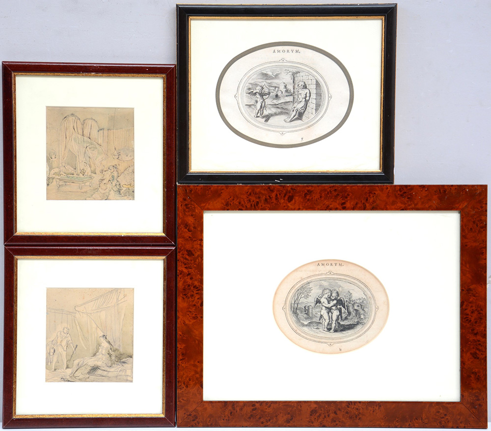 Lotto di due incisioni con putti e due riproduzioni di disegni con scene d'interno, misure differenti, in cornici (difetti)