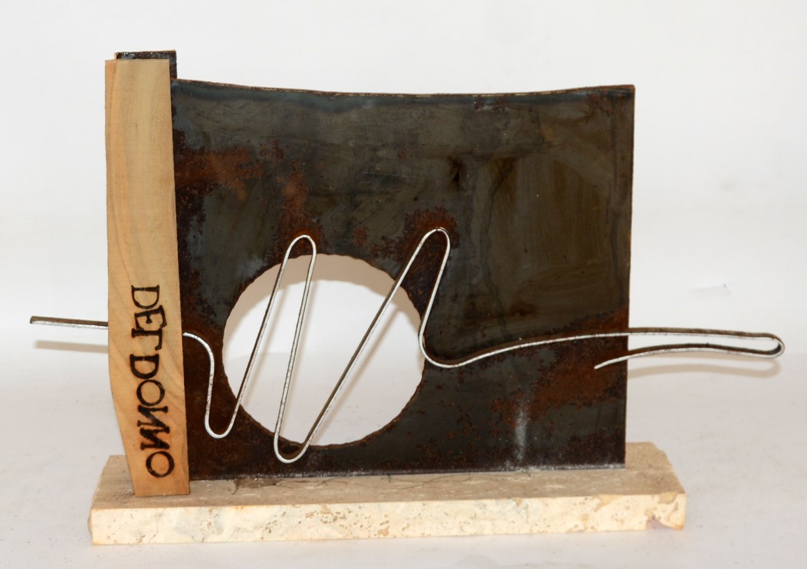 Ignoto "Senza titolo" scultura multiplo in legno e ferro (h cm 34), su base in pietra. In cassetta recante firma ed etichetta ArteInvest "Del Donno Antonio" (difetti)