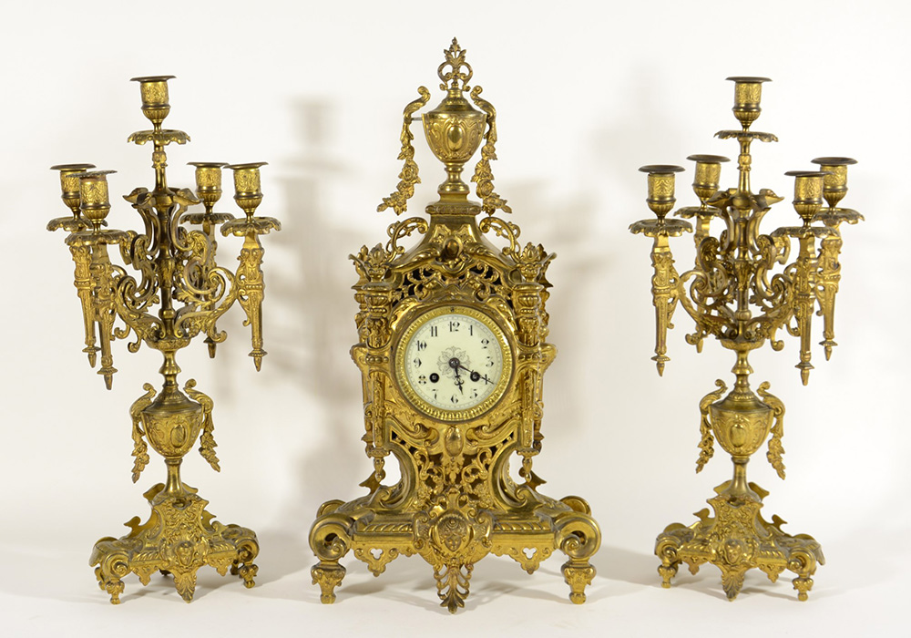 Trittico da camino in bronzo composto da due candelieri a cinque braccia (h cm 50) e da un orologio decorato a racemi e volute con quadrante in smalto con numeri arabi, movimento con carica settimanale delle ore e delle mezza, sospensione a molla (h cm 53) (lievi difetti e mancanze)
