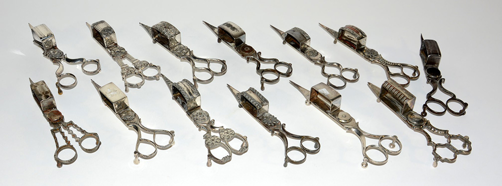 Lotto composto da tredici spegnimoccolo in metallo argentato di decoro diverso (difetti)