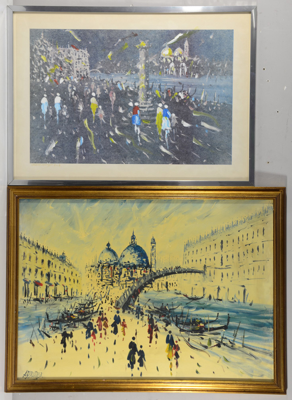 Abruzzese, lotto composto da un dipinto e da una stampa prova d'artista raffiguranti scorci di Venezia, misure diverse. In cornici