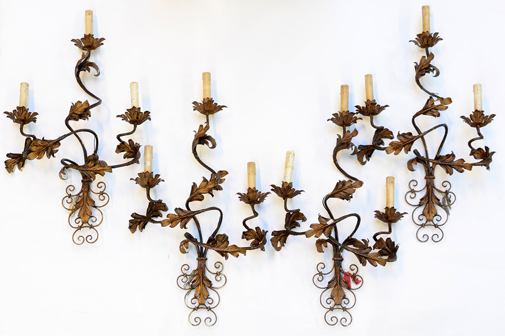 Gruppo di quattro appliques a tre luci in metallo decorato a racemi (difetti)