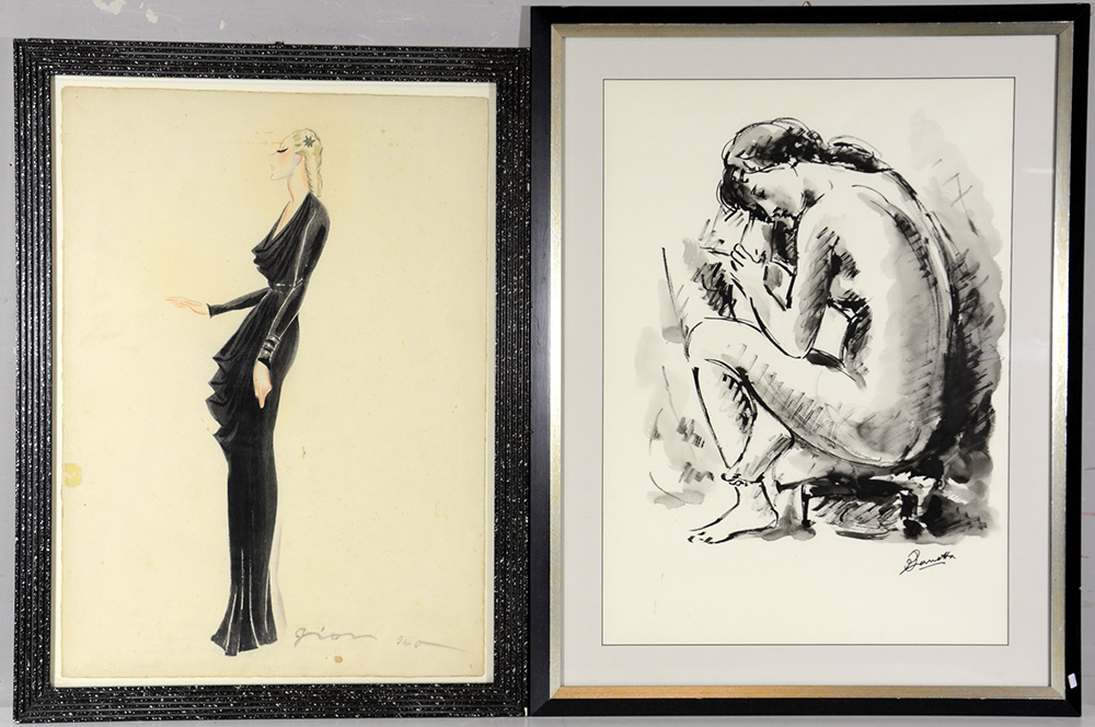 Firme indecifrate "Figure femminili" lotto composto da due opere a tecnica mista su carta, misure diverse, firmate in basso. In cornici