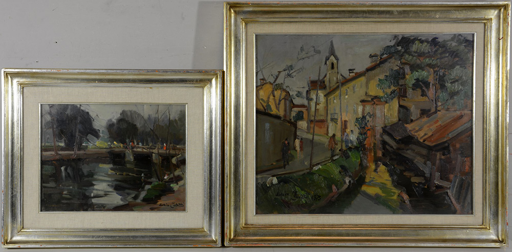 Carozzi Enrico. "Scorci di citt‡" lotto composto da due dipinti di tecniche e misure diverse, firmati. In cornici
