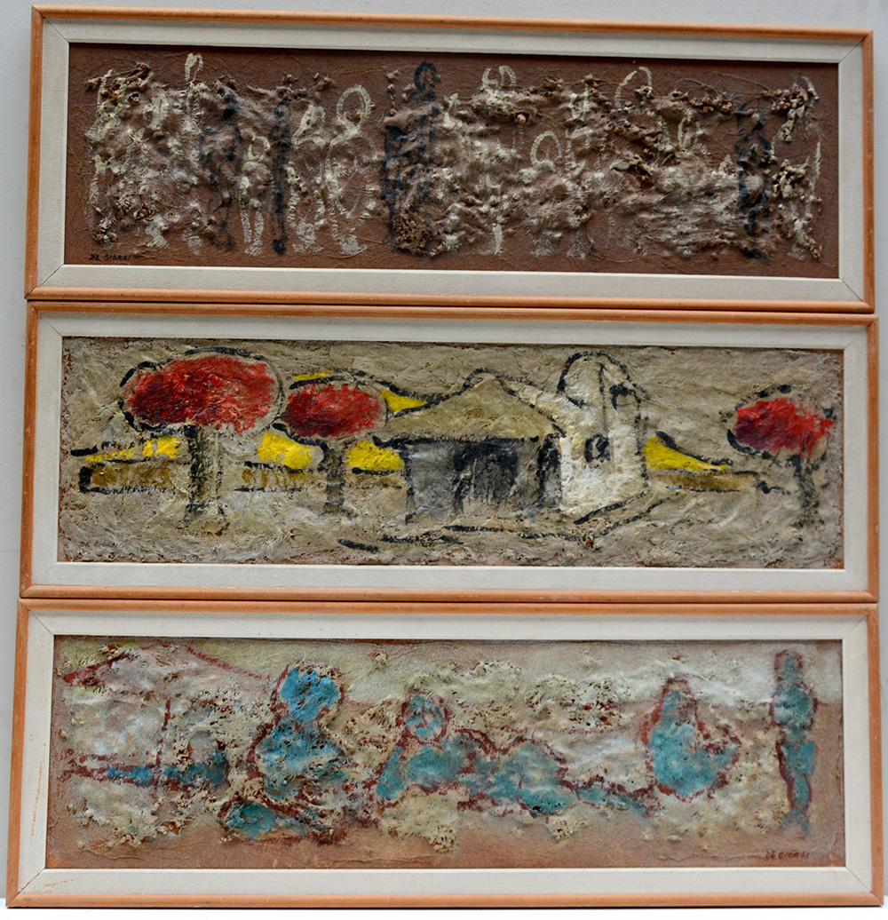 De Giorgi "Composizioni" Lotto composto da tre dipinti a tecnica mista su supporti diversi (cm 23,5x85) firmati. In cornici (difetti)
