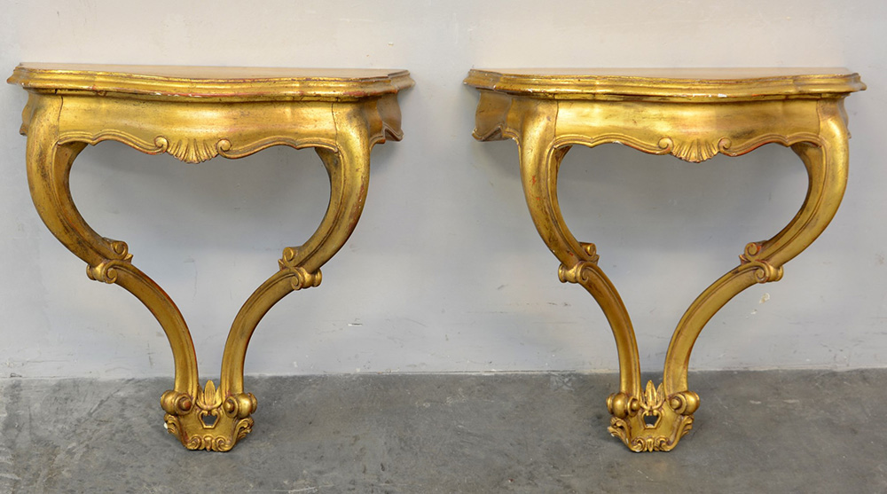 Lotto 463 | Coppia di mensoline di forma mossa, in legno dorato e dotate di cassetto,...