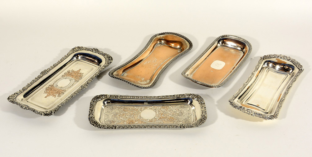 Lotto composto da cinque vassoietti in metallo argentato (lievi difetti)