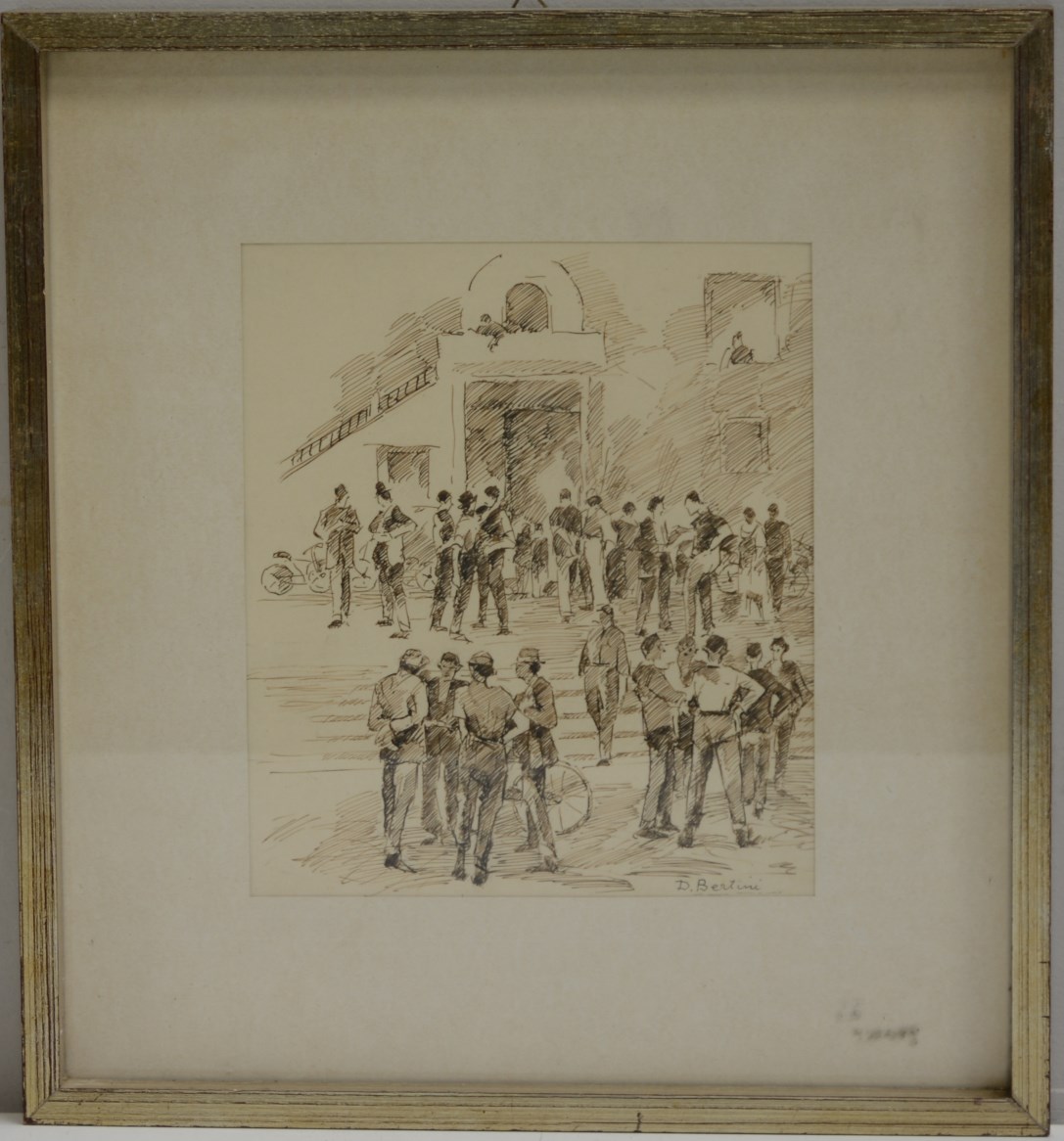 Lotto 475 | Bertini "Scorcio di paese con figure" china su carta (cm 23x20) firmato in...
