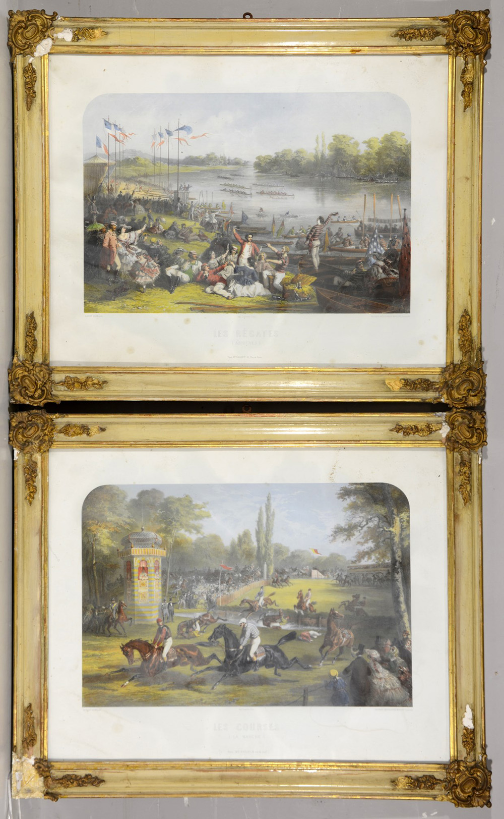 Coppia di stampe a colori francesi (cm 49x63). In cornici laccate e dorate (mancanze alle cornici)