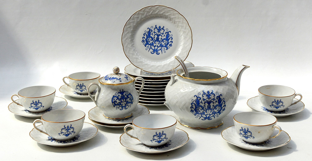 Manifattura di Limoges "Louis XIII" servizio da the in porcellana bianca a decoro azzurro composto da undici piatti, otto piattini, sei tazzine, una zuccheriera e una teiera (difetti e mancanze)
