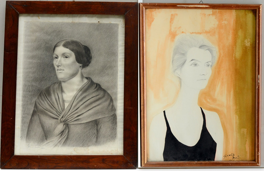 AA. VV. "Ritratti femminili" lotto composto da due dipinti di tecniche e misure diverse. In cornici (difetti)