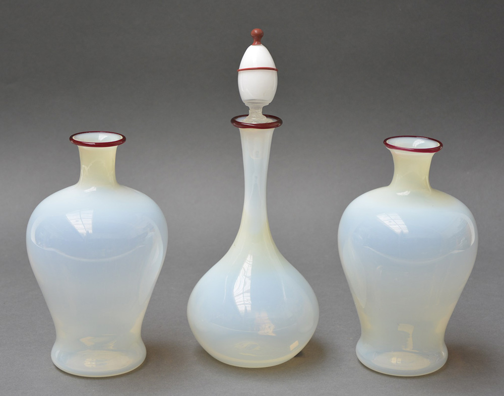 Manifattura di Murano. Tre bottiglie in vetro soffiato opalescente con orlo applicato in vetro rosso. prima met‡ del sec XX (h cm 31) (difetti)