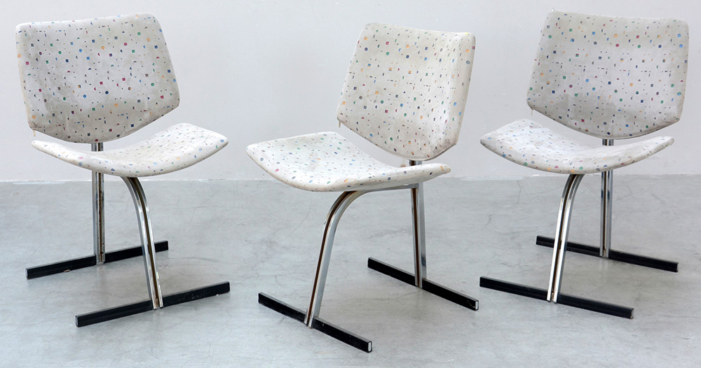 Vittorio Introini (attribuito) tre sedie con struttura in metallo cromato e laccato nero. Seduta rivestita in tessuto grigio a decori policromi. Produzione Saporiti, Italia anni '70 (difetti)