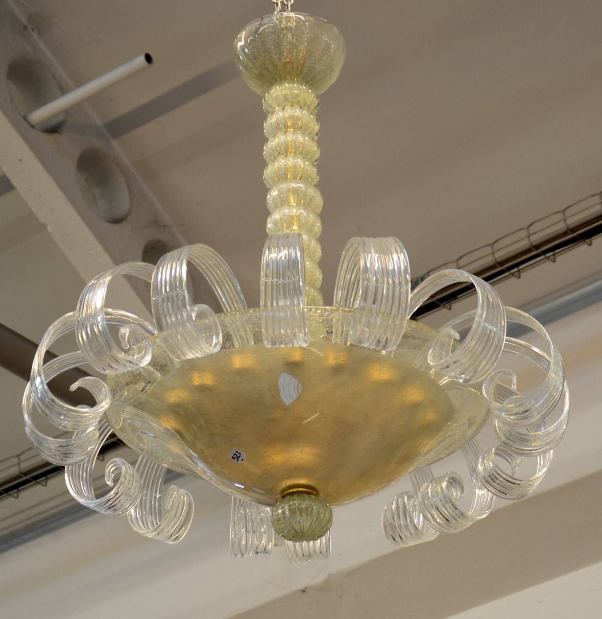 Manifattura di Murano. Lampada a sospensione in vetro soffiato incolore ed a bolle, con corona di volute costolate. Seconda met‡ sec. XX