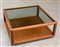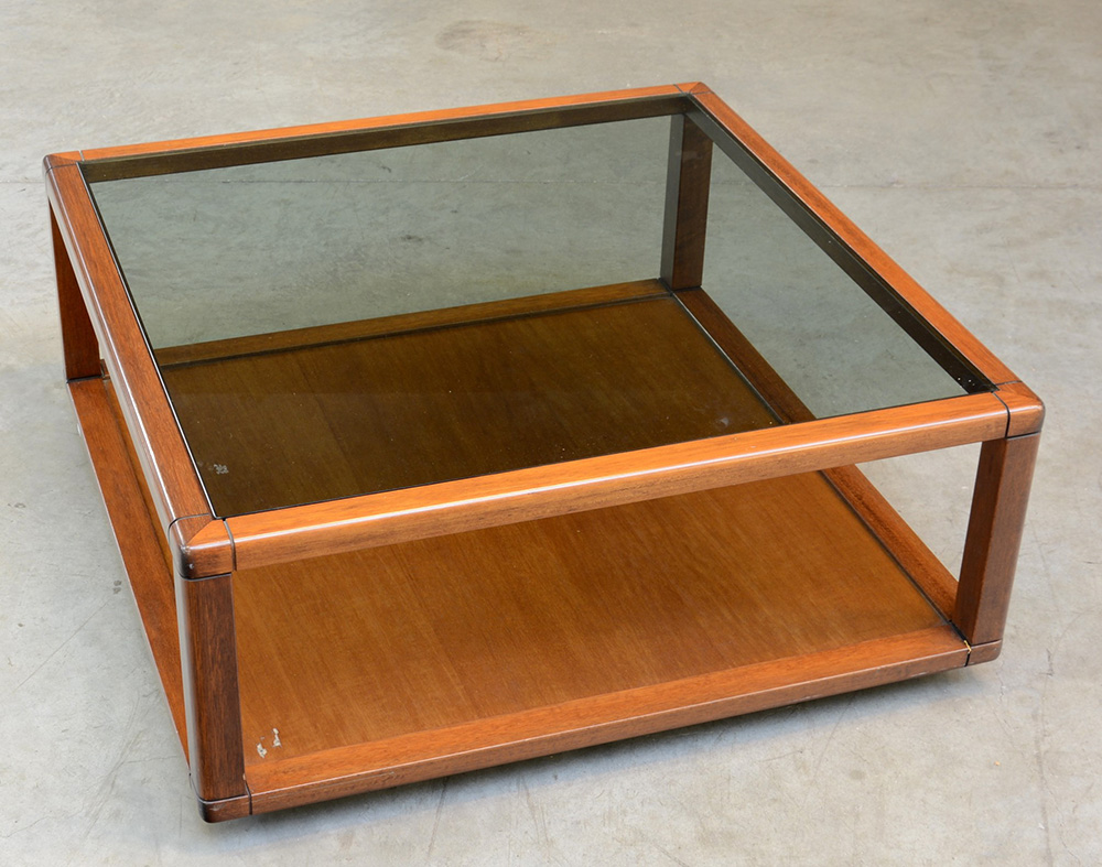 Tavolino basso da salotto in legno massello con piano in vetro fumÈ e sottopiano. Italia, anni 70 (cm 79x34x79) (lievi difetti)