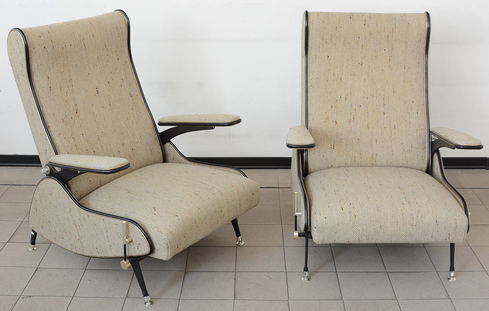 Coppia di poltrone reclinabili con struttura in metallo e rivestimento in lana beige. Italia, anni 60 (cm 73x94x80) (lievi difetti)