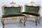 Colli (attr.) , coppia di divanetti a due posti con struttura mossa di gusto rococÚ, in ferro battuto dorato decorato con foglie e fiori, seduta e schienale in velluto verde. Torino, anni '40 (cm 120x113x45) (difetti)
